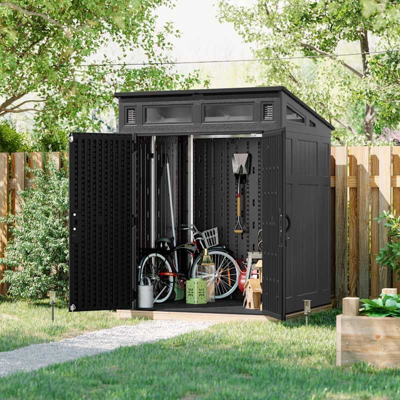 A combination of strength and storage, the 6 ft. x 5 ft. Modernist Storage Shed by Suncast Features 6m3 of storage space and is ideal for storing all your outdoor equipment.