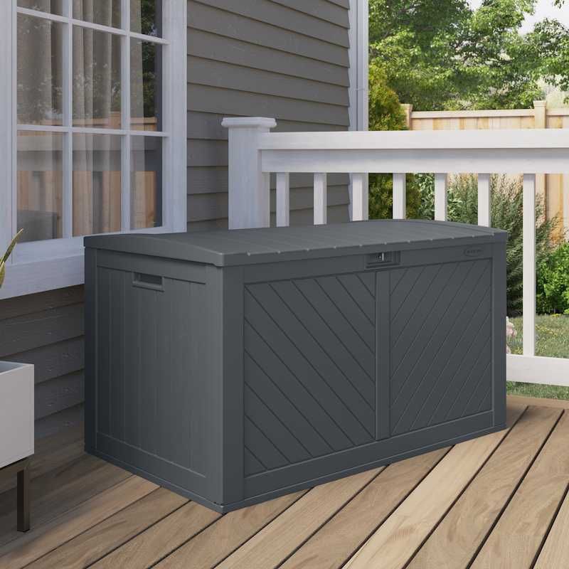 This deck box will solve all of your outdoor patio storage needs. The reinforced lid offers a unique seating solution to your space along with struts that allow for easy lift of the lid.